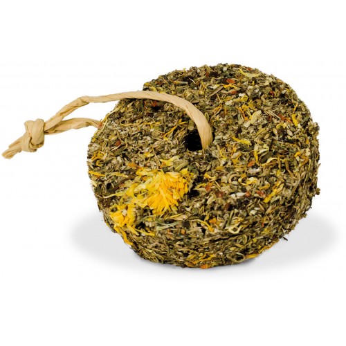Leckeres Rad zum Aufhängen im Nager- oder Vogelheim. Mit vielen gesunden Kräutern, verfeinert mit Löwenzahn und Ringelblume. Perfekte Beschäftigung.